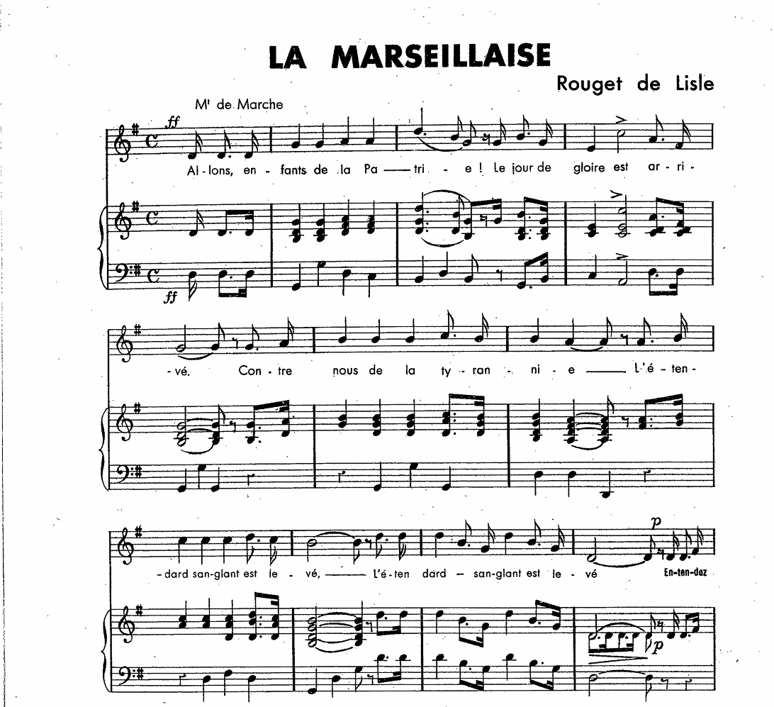 Claude Joseph Rouget de Lisle (1760–1836), officier et musicien français, composa Le Chant de guerre pour l’armée du Rhin à Strasbourg, en avril 1792. Ce chant, repris par les volontaires marseillais marchant vers Paris, devint La Marseillaise et le symbole de la Révolution française. Poète patriote, Rouget de Lisle croyait à la liberté des peuples et à la fraternité universelle. Il mourut pauvre, mais son œuvre survécut à tous les régimes et resta l’une des voix les plus indestructibles de l’histoire.
